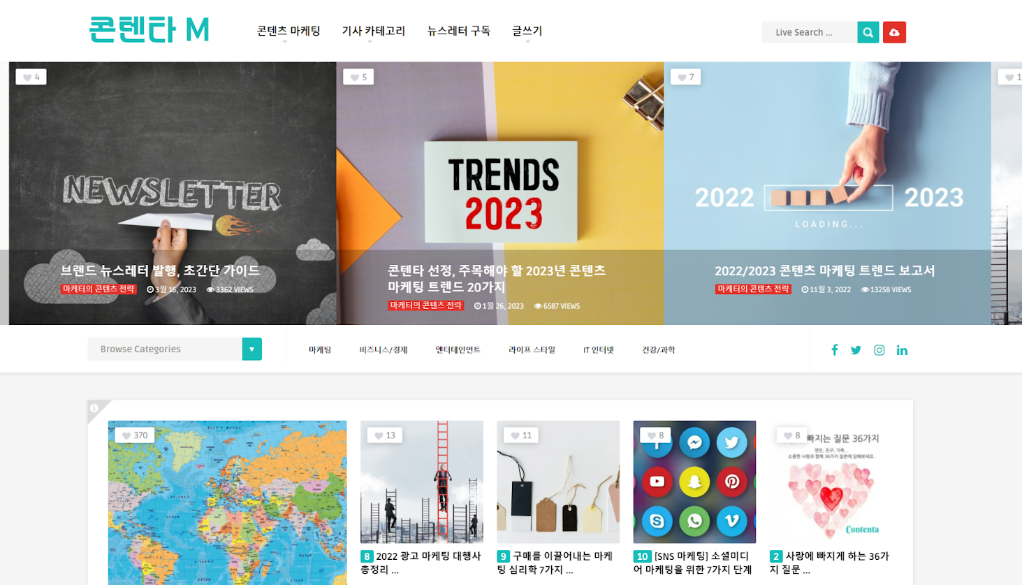 콘텐타 매거진은 콘텐츠 마케팅에 특화된 아티클을 제공하는 사이트입니다. 콘텐타 소속 전문 집필진이 콘텐츠 마케팅 관련 트렌드와 뉴스, 리포트 등을 심도 있게 작성하여 공유하고 있어요. 특히, B2C 마케터에 비해 상대적으로 국내 사례와 정보를 많이 얻기 힘든 B2B 콘텐츠 마케터를 위한 가이드가 준비되어 있답니다.