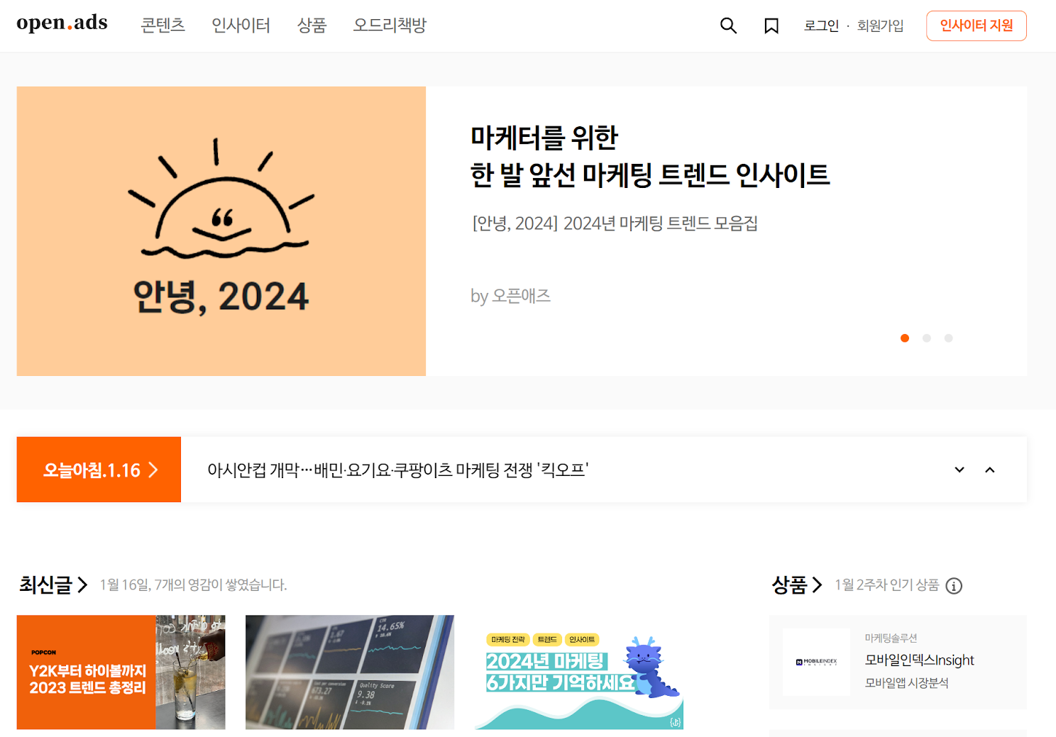 오픈애즈는 마케팅 주제별 콘텐츠를 온라인 매거진처럼 큐레이션 해서 보여주는 플랫폼입니다. 마케팅 최신 트렌드, 마케터가 주목하는 최신 키워드 등 다양한 정보를 맞춤형으로 보여주고 있어요. 다른 기업의 마케팅 부서에서 ‘오픈 애즈’에 기고하는 경우도 있으니, 마케팅 현업의 동향을 파악하고 싶을 때 유용합니다.