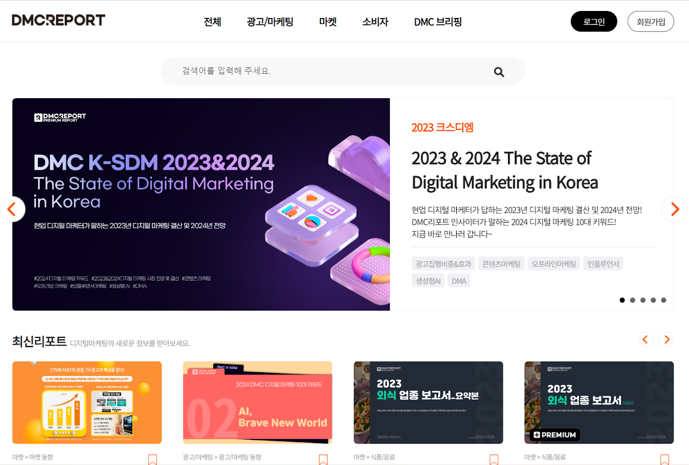 DMC리포트는 SBS의 랩사인 ‘DMC 미디어’에서 발행하고 있으며, 디지털 마케팅 이슈와 트렌드, 키워드 관련 리포트를 확인할 수 있는 곳입니다. 마케팅, 커머스, 소셜, 모바일 등 디지털 마케팅에 최적화되어 있어요. 단, 일부 리포트는 유료로 열람이 가능합니다.