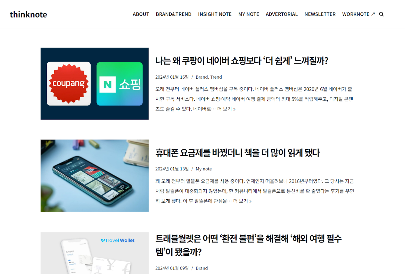 ‘생각노트’는 IT 기업 브랜드 마케터 출신이자 책 <생각의 쓰임>의 저자가 브랜드 및 트렌드에 대해 분석하고, 기록하는 개인 블로그입니다. 개인 블로그인 만큼 최신 콘텐츠가 쉴 틈 없이 쏟아지는 곳은 아니니, 트렌드를 빠르게 확인하는 데엔 적합하지 않아요. 대신, 마케팅 관련 인사이트를 깊이 있게 파고들고 싶을 때나, 브랜드 마케팅 관련 통찰을 얻고 싶을 때 추천합니다.