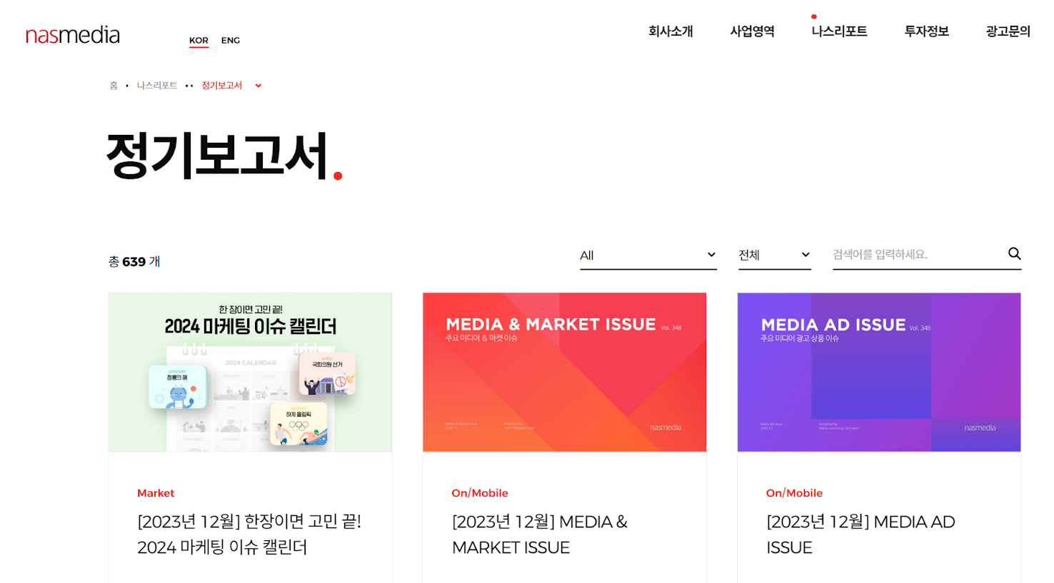 디지털 광고 대행사인 나스 미디어는 정기 보고서를 발행 및 공개하고 있습니다. 업종별 디지털 광고 인사이트를 바탕으로 보고서가 구성되고 있으며, 아이디어 참고용은 물론 마케팅 전략을 세울 때도 도움이 되는 곳입니다.