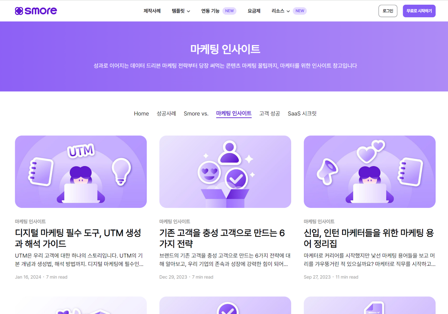 스모어는 마케팅 인사이트를 제공하는 기업 블로그를 운영하고 있어요. 마케팅 용어 정리 및 활용 가이드, 디지털 마케팅과 콘텐츠 마케팅에 특화된 내용들까지. 마케팅 실무에 당장 도움이 될 수 있는 인사이트 관련 주제들을 다루고 있답니다. 열람은 모두 무료예요.