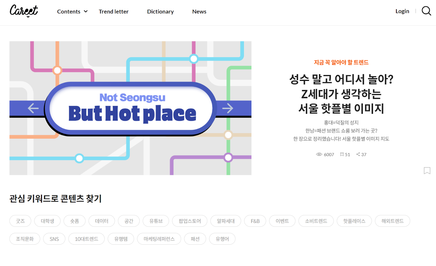 MZ 세대를 핵심 타겟으로 마케팅 캠페인을 전개하고 싶으신 분들이라면 ‘캐릿’을 참고해 보세요. MZ 세대가 열광하는 콘텐츠와 아이템, 주요 키워드 등을 알려주며, 왜 그것이 바이럴 되고 있는지 실제 MZ 세대가 의견을 덧붙인 내용도 함께 확인할 수 있습니다. 단, 아티클 전문을 읽으려면 유료 멤버십에 가입해야 해요.