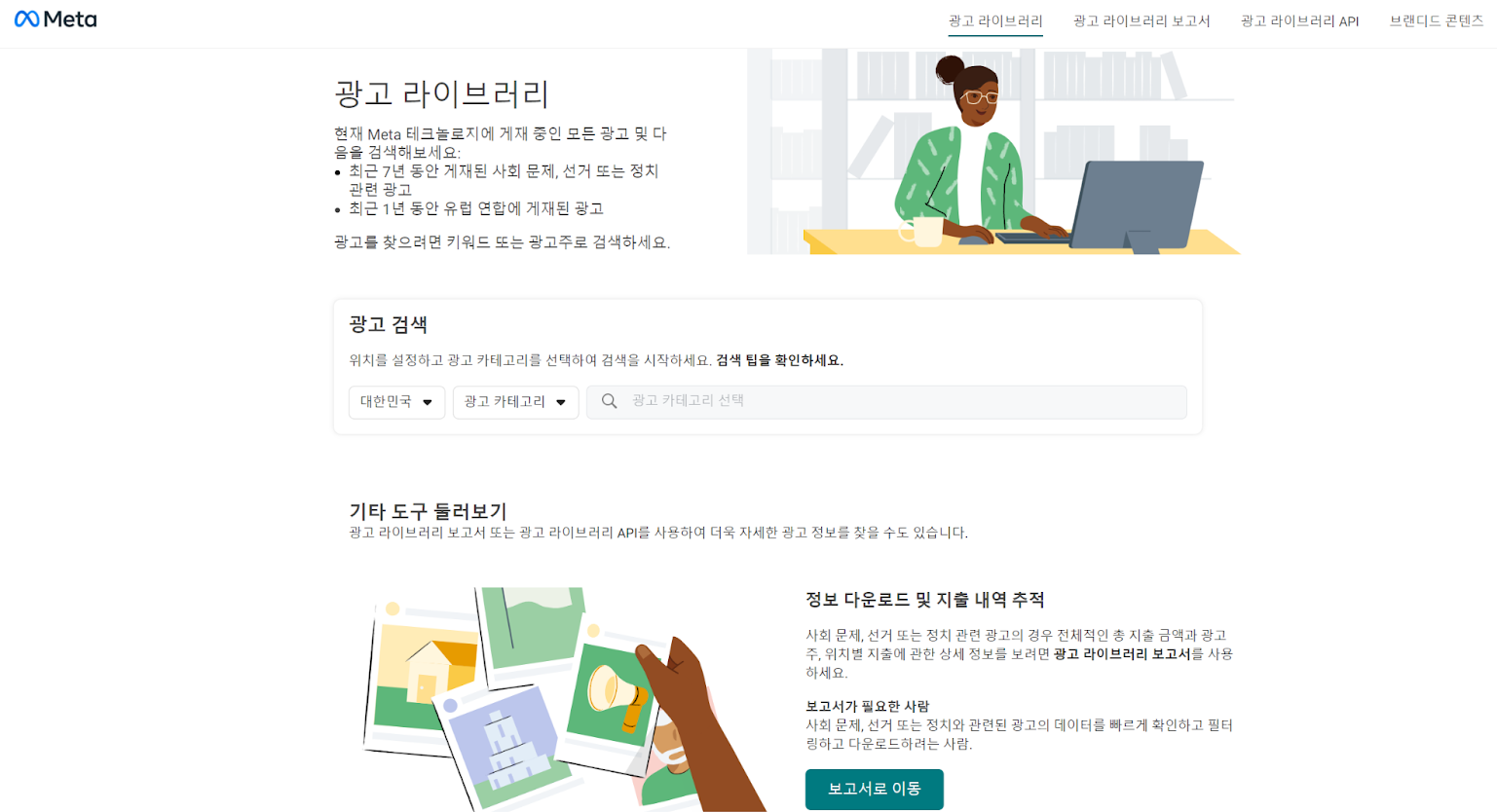 SNS 채널을 중심으로 마케팅을 진행할 분들이라면 메타가 직접 운영하는 ‘메타 광고 라이브러리’를 참고해 보세요. 페이스북과 인스타그램에서 집행되고 있는 모든 광고를 검색할 수 있습니다. 경쟁사나 창의적인 기획안을 잘 뽑는다고 생각하는 회사의 계정을 검색하여, 벤치마킹하는 방향으로도 활용할 수 있어요. 광고주별 지출 금액을 볼 수 있으므로 동종 업계는 얼마의 돈을 들여 SNS 마케팅을 진행하는지 참고할 수 있죠.