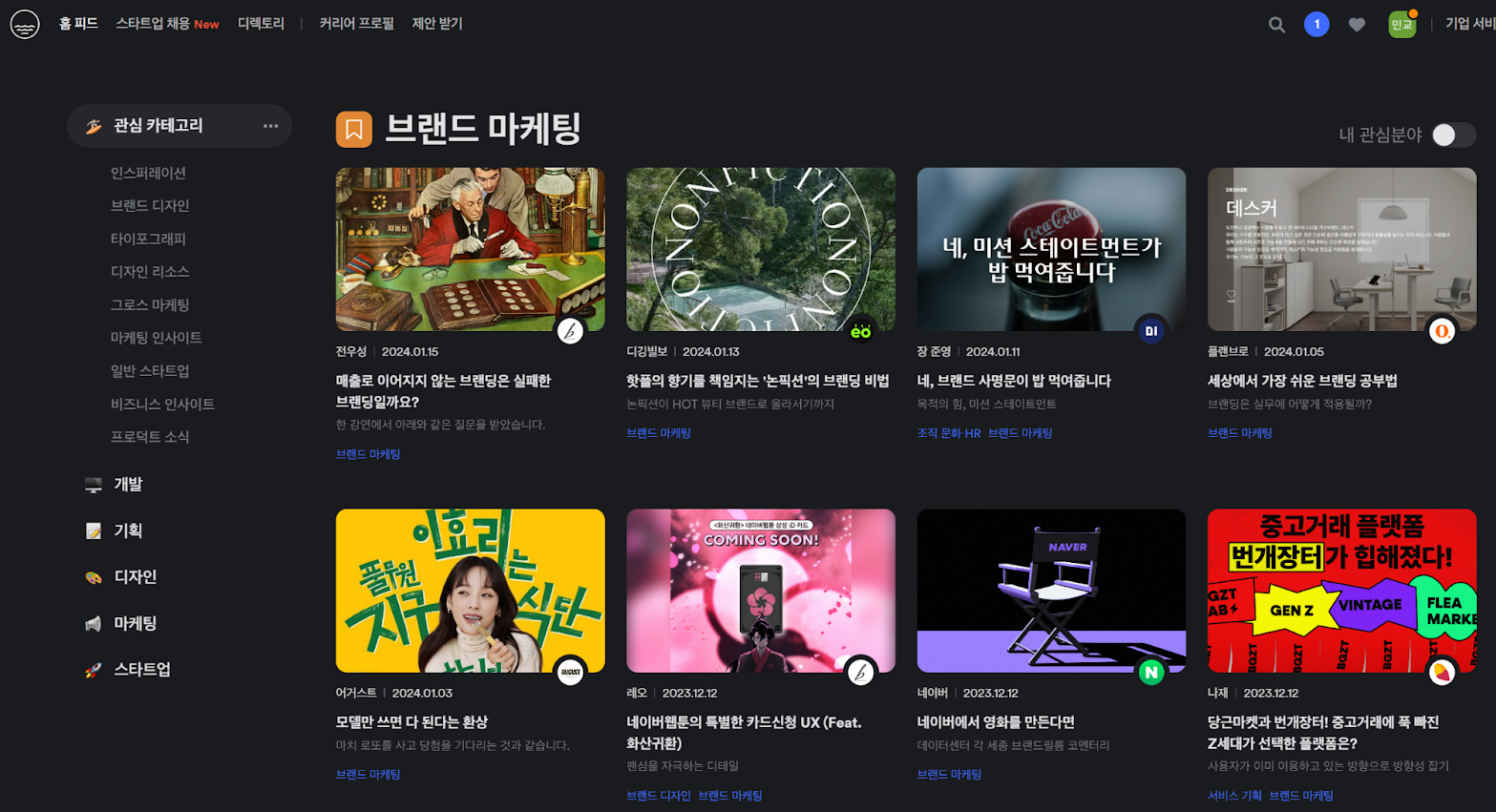 서핏은 본래 디자이너를 위한 콘텐츠 큐레이션 플랫폼에서 시작했지만, 차츰 영역을 넓혀 현재는 기획, 마케팅, 개발 등 다양한 분야의 아티클을 보여주고 있습니다. 마케팅은 일반, 그로스, 브랜드 마케팅, 마케팅 인사이트의 카테고리로 구성되어 있어요. 브런치나 뉴스레터, 기업 블로그 등의 글을 한곳에서 볼 수 있기에, 일일이 여러 레퍼런스 사이트를 확인하기 번거롭다면 서핏을 추천해요.