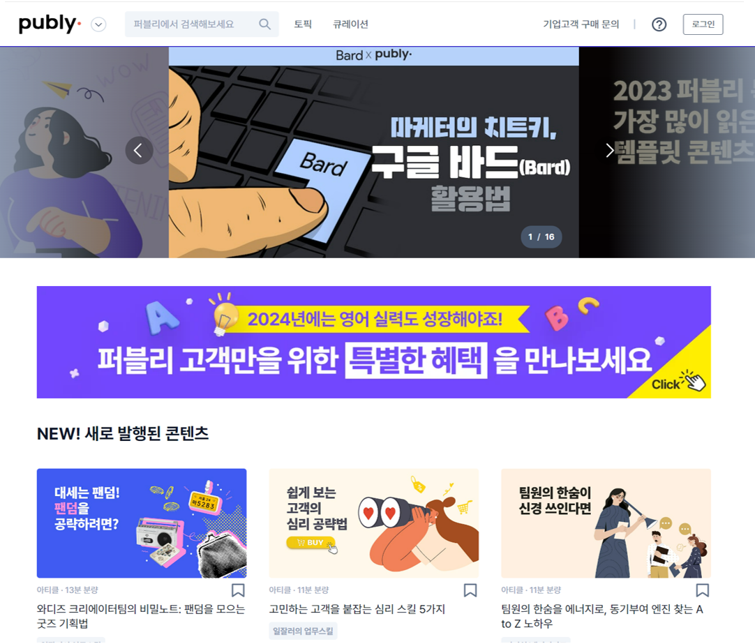 ‘랜선 사수’를 자처하는 퍼블리는, 마케팅 용어 관련 정보나 업무 노하우를 얻기 좋은 곳이에요. 마케팅 트렌드는 물론, 실무자들을 위한 커리어 스킬 및 자기 계발 콘텐츠도 준비되어 있습니다. 마케터는 기획력도 중요하지만, 커뮤니케이션이나 리더십, 매니지먼트 등의 능력이 필요할 때가 있죠. 이럴 때 참고하기 좋은 콘텐츠도 카테고리 별로 업로드되고 있어요. 단, 유료 구독 서비스로 운영되고 있어요.
