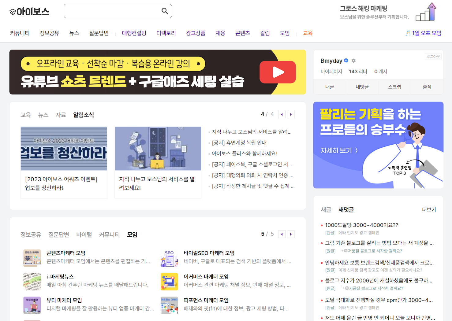 아이보스는 국내 마케터들의 커뮤니티가 활성화된 사이트로, 콘텐츠 마케터부터 퍼포먼스 마케터까지 마케팅 분야별로 정보를 얻을 수 있어요. 마케팅 채널이나 데이터 추적 툴 관련 질의응답을 받을 수 있으며, 분야별 마케터 온라인 모임에도 참여해 현업 마케터들과 소통할 수 있습니다.
