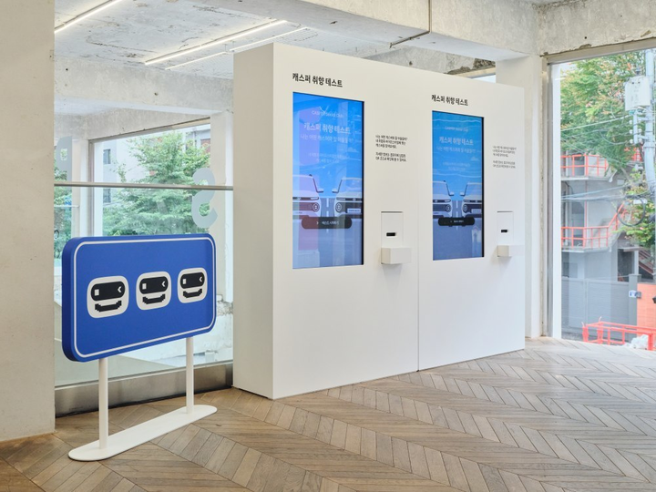 현대자동차는 ‘2025 캐스퍼 팝업스토어’를 위해 ‘캐스퍼 취향 테스트’를 제작했습니다. 현장에는 키오스크에 콘텐츠를 배포하고, 콘텐츠 결과 페이지가 영수증으로 인쇄되는 디테일을 더해 큰 호응을 불러일으켰죠.