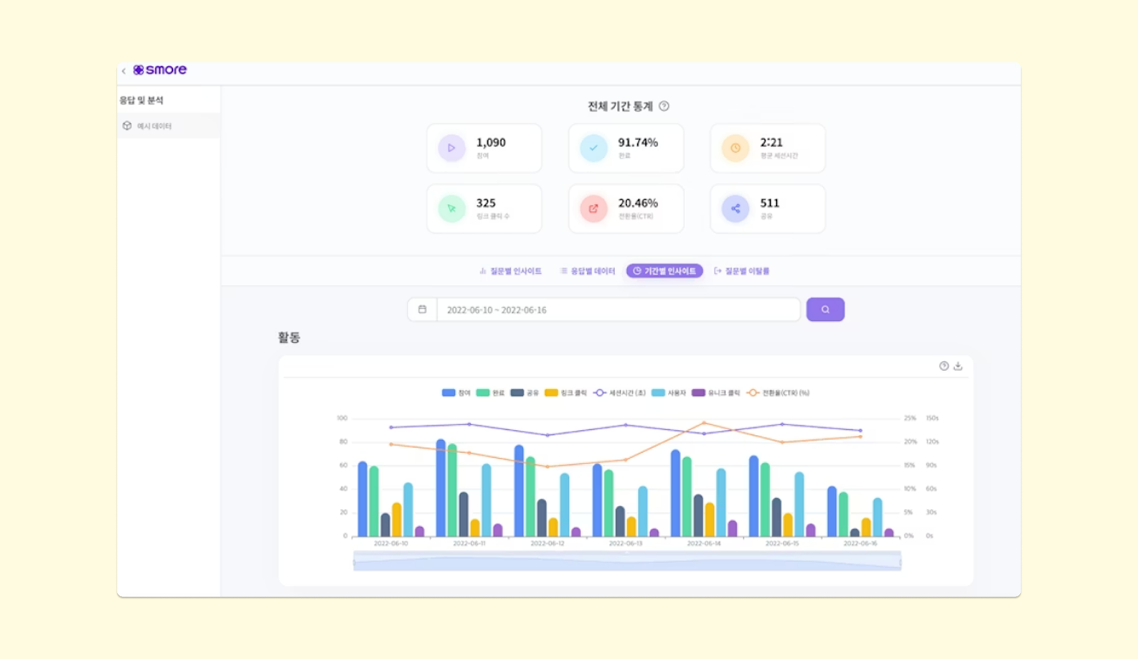 스모어 데이터 대시보드에선 플레이 수, 공유 수, 정보 수집 현황 등의 주요 지표를 한눈에 확인할 수 있습니다. 어떤 시간대에 참여가 집중되는지, CTR은 얼마나 되는지 등 마케터가 꼭 확인해야 하는 지표도 즉각 파악할 수 있어요. 이러한 인사이트는 행사 진행 중에도 운영 전략을 조정하는 데 활용할 수 있고, 행사 종료 후에는 ROI를 측정하고 다음 기획에 반영할 수 있는 근거 자료가 됩니다.