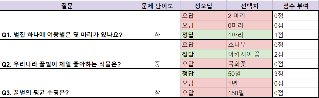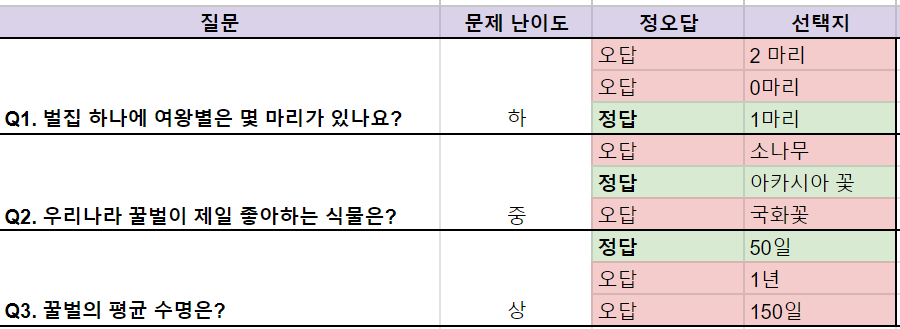 👉각 질문 별로 문제 난이도가 다를 수 있도록 구성해 보세요! 더욱 완성도 높은 콘텐츠를 만들 수 있답니다.