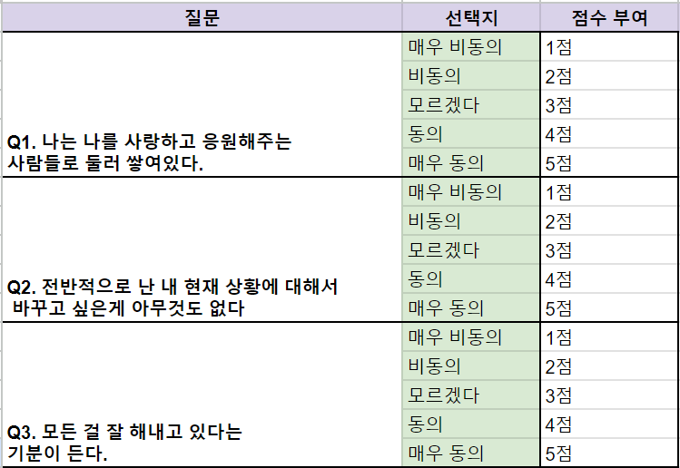 각 선택지 별로 부여할 점수를 정하고, 표로 정리해 보세요! 이때 주의해야 할 점은 결과 페이지의 점수 범위가 선택지에 부여한 점수의 총합으로 구성된다는 거예요. 만약 결과 페이지의 점수 범위를 키우고 싶다면 선택지에 부여한 점수를 높여 주어야 합니다.