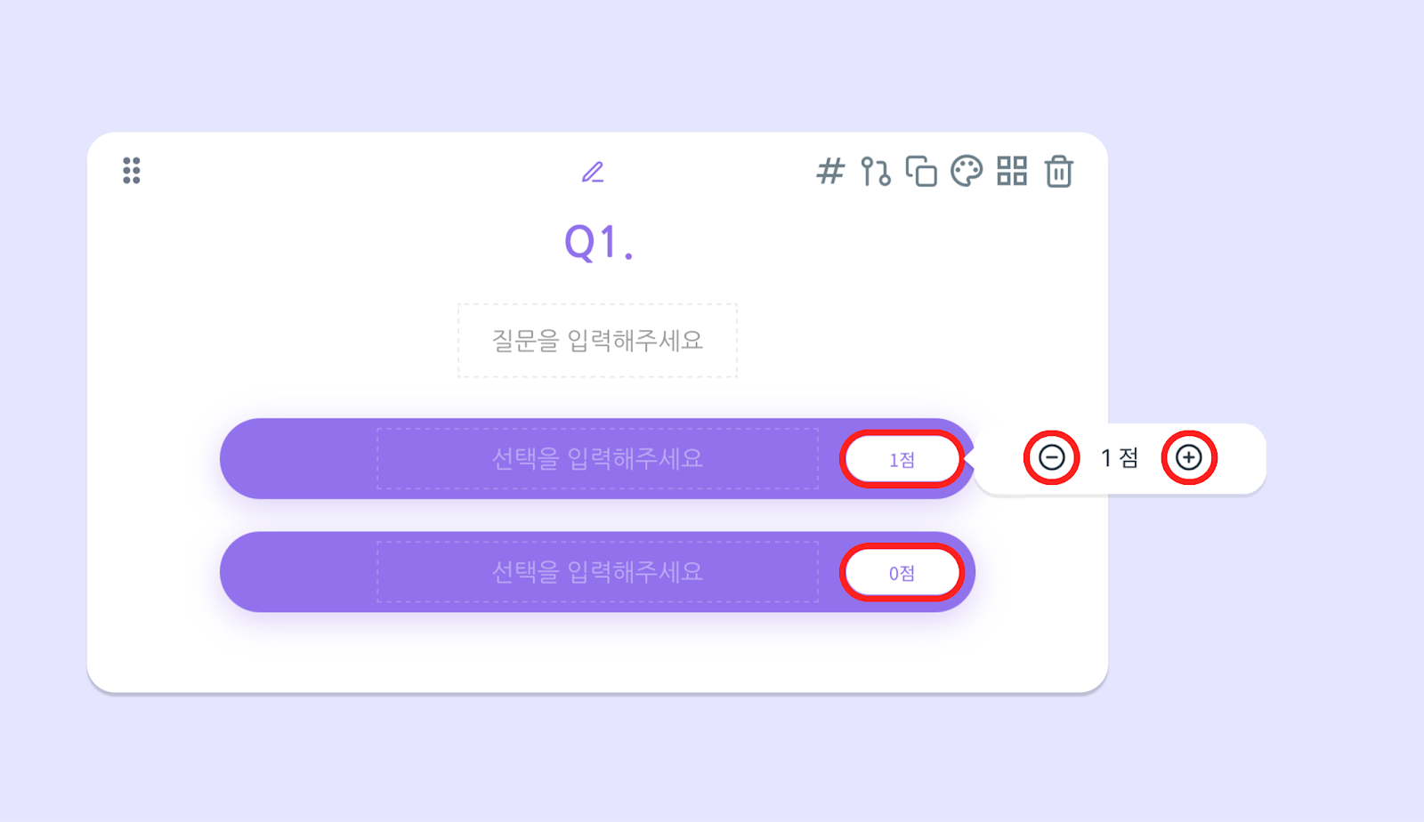 점수 퀴즈는 선택지별 점수 배점을 각각 다르게 설정할 수 있어요. 반면 정오답 퀴즈는 문제에 대한 ‘정답’과 ‘오답’ 선택지만을 설정할 수 있어 모든 문제의 배점이 동일합니다.