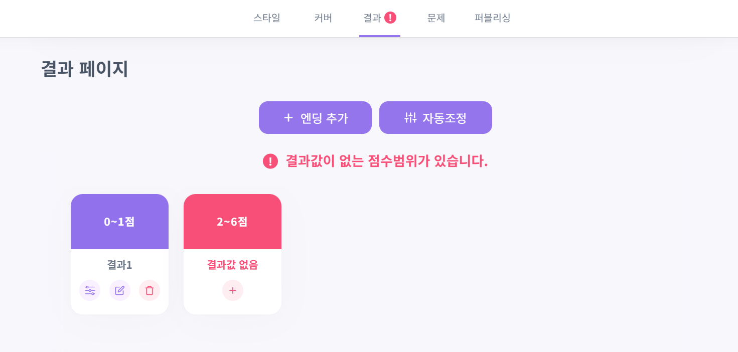 결과 페이지로 가면 ‘결과 페이지가 없는 점수 범위가 있습니다’라는 문구가 뜰 거예요. 당황하지 않으셔도 돼요. 🙂 우선 [엔딩 추가] 버튼을 눌러 원하시는 결괏값 수 대로 결과 카드를 추가해 주세요.