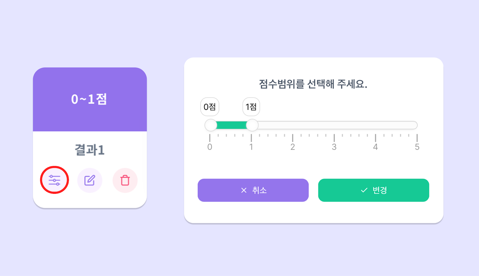 이후 각 카드의 가장 좌측 [점수 범위 변경] 버튼을 눌러, 기획하신 대로 점수 범위를 조정해 주세요!