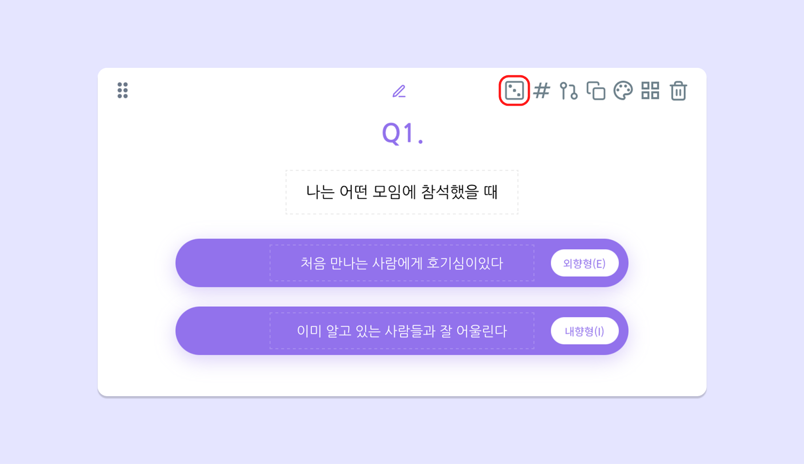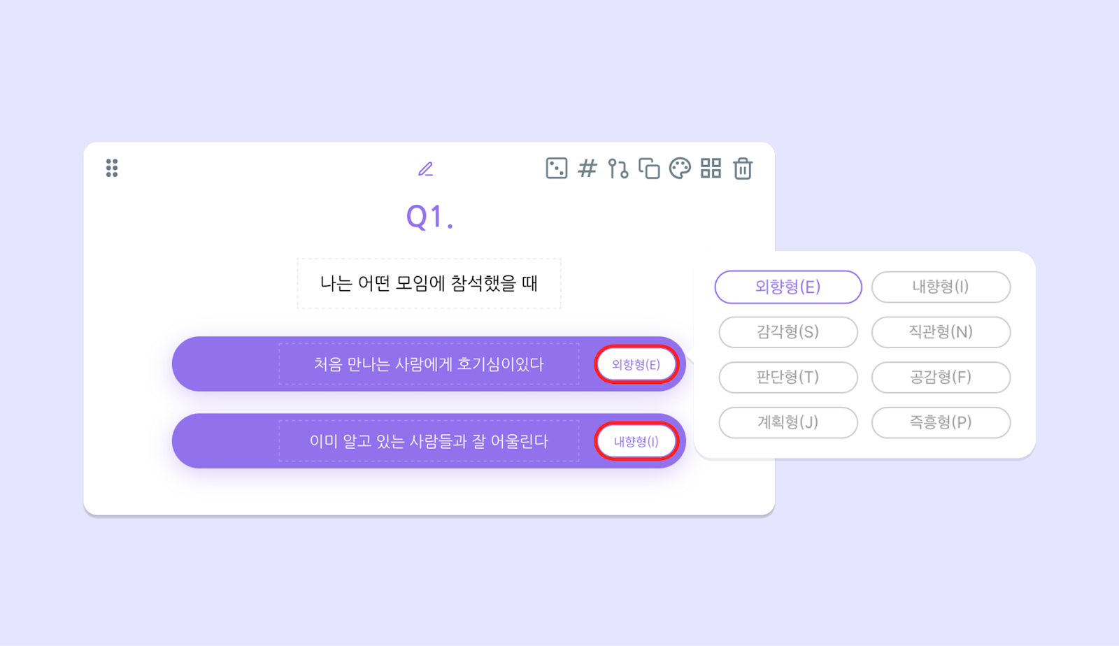 짝수 개수로 추가해 주세요. 이때 변인은 동일한 비율로 구성되어야 합니다. 예를 들어 선택지가 4개라면, E,E,E,I (❌) E,E,I,I (🟢) 비율로 변인이 배정되어야 해요.