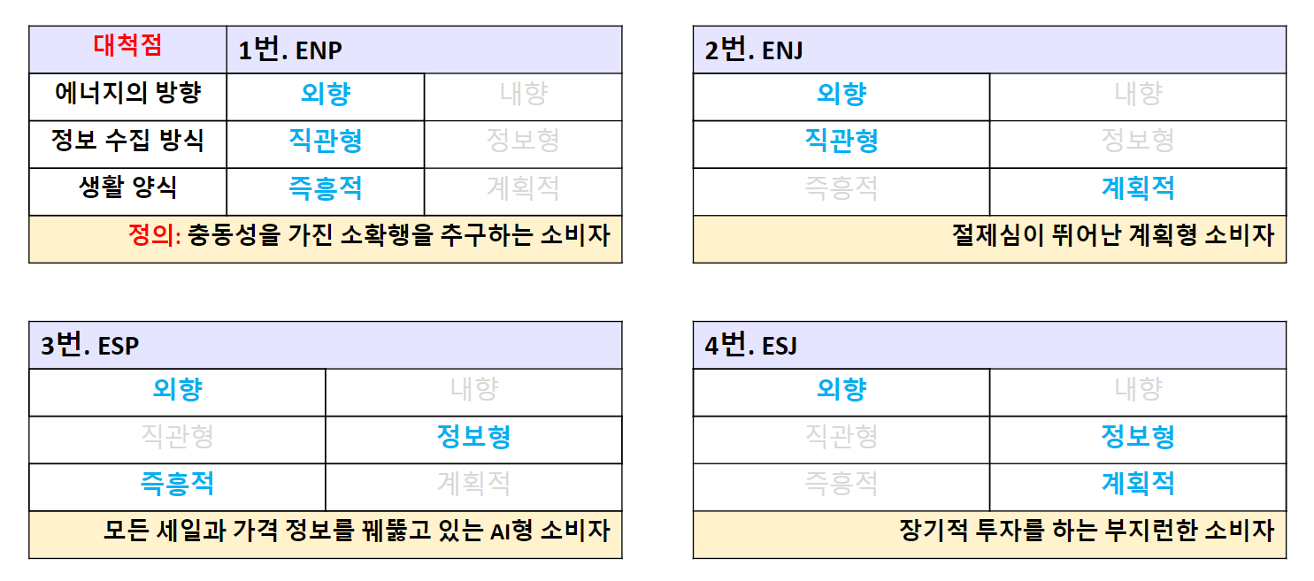 Step 2에 작성한 대척점을 바탕으로 각 결괏값을 아래 표처럼 정리하면, 결과적으로 어떤 성향을 보이는 유형이 되는지 기획할 수 있어요.