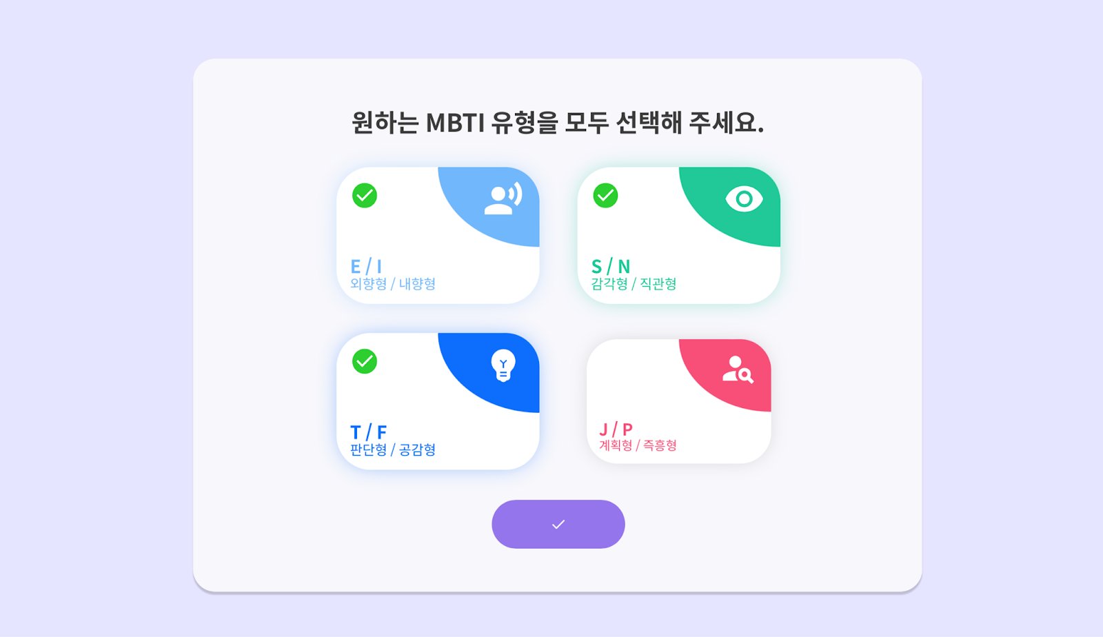 페어링 알고리즘은 각 변인이 결괏값의 한 범주를 규정하고, 각각의 범주들이 모여서 하나의 유형을 이루어요. 가령 ENFP라는 유형은 E/N/F/P라는 4가지 범주의 조합으로 이루어진 결괏값인 거죠.