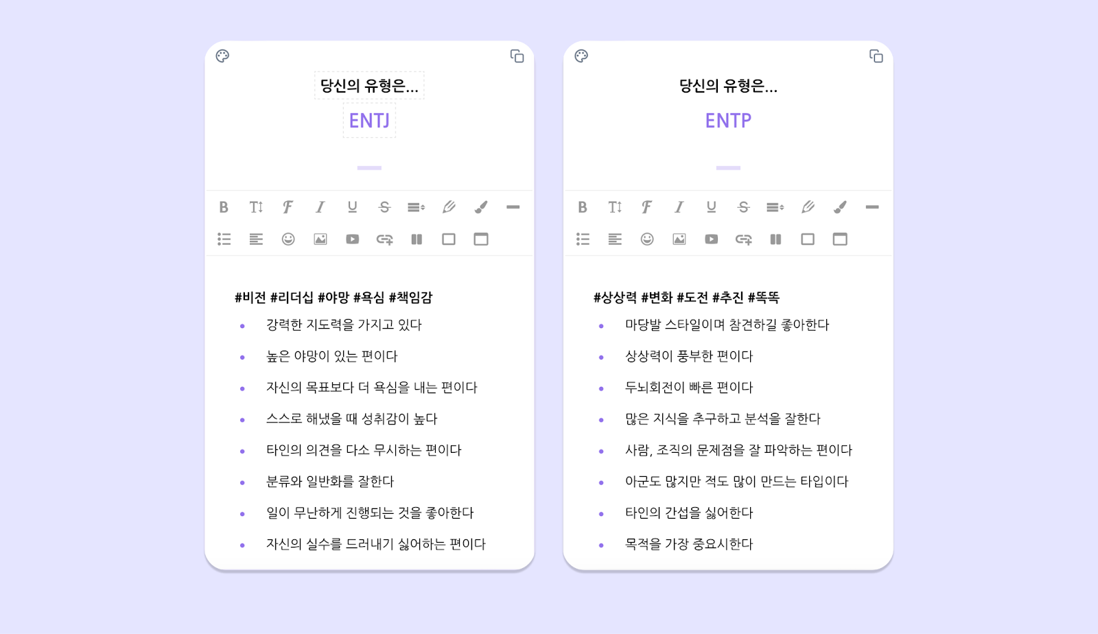 Step 3에서 기획해둔 내용에 맞게 각 결과 페이지의 내용을 작성해 주세요. 만약 해당 유형을 설명할 수 있는 문구가 더 떠오르지 않는다면, 각 결과 페이지에 세팅된 성격 유형의 조합 별 설명을 참고하면 좋아요.