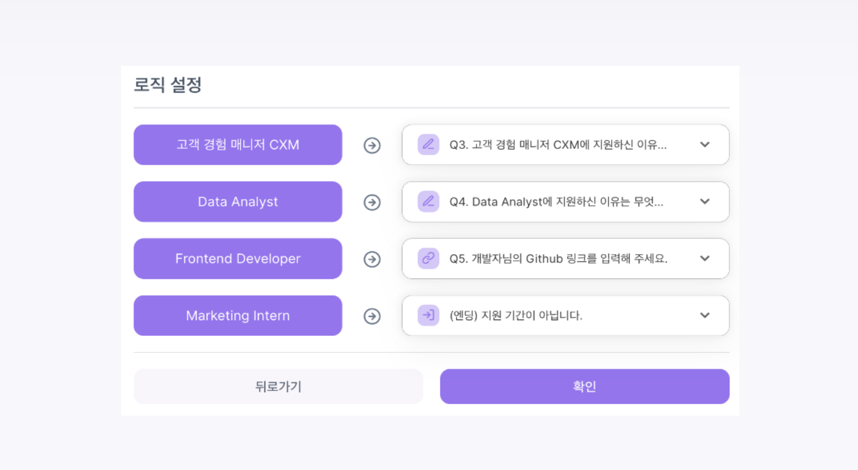 응답자의 선택지에 따라 다음 문제가 달라지는 ‘로직 점프’ 즉, 조건 분기 설정 기능은 설문조사에 필수적인 기능입니다. 스모어는 더욱 직관적인 편집 화면을 갖추고 있어, 손쉽게 로직을 설정할 수 있어요. 특히 네이버 폼에서는 가능하지 않았던, 이전 질문으로 로직을 연결하는 것도 가능합니다.
